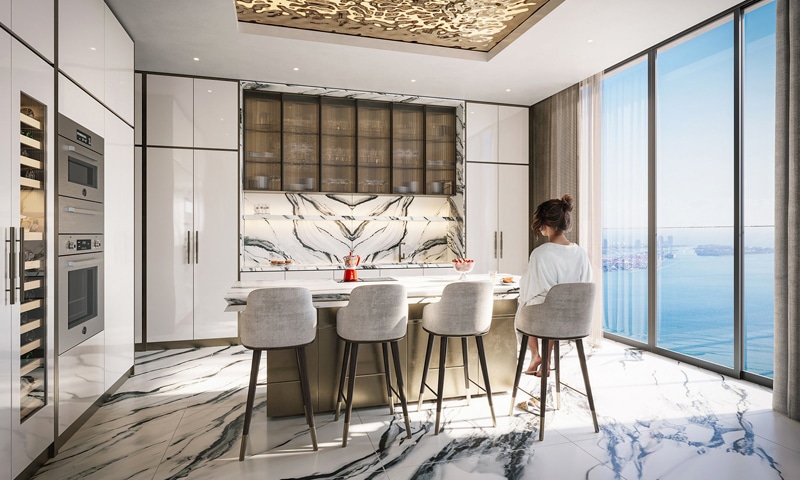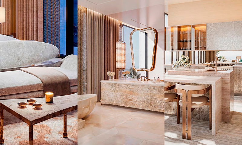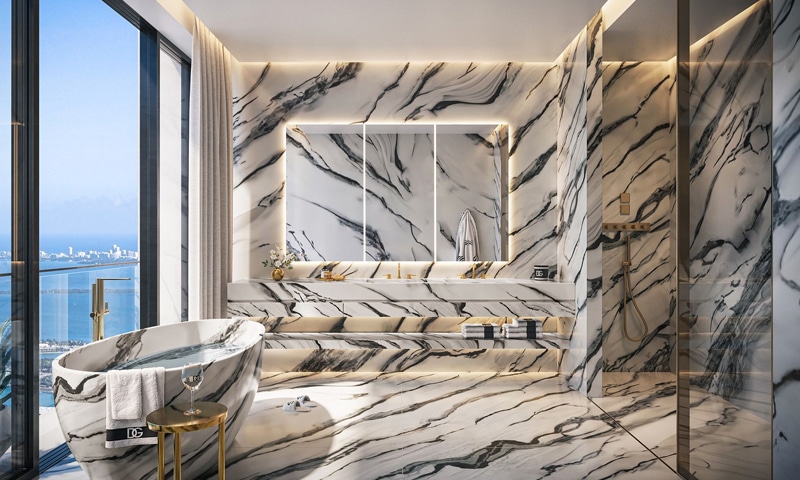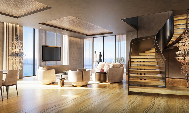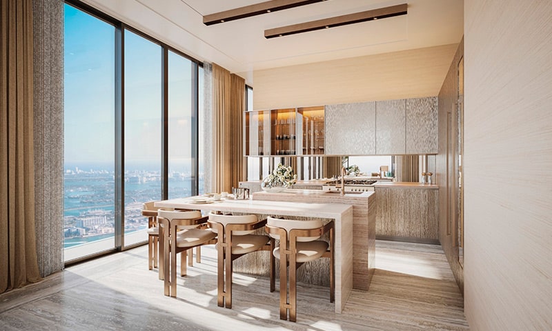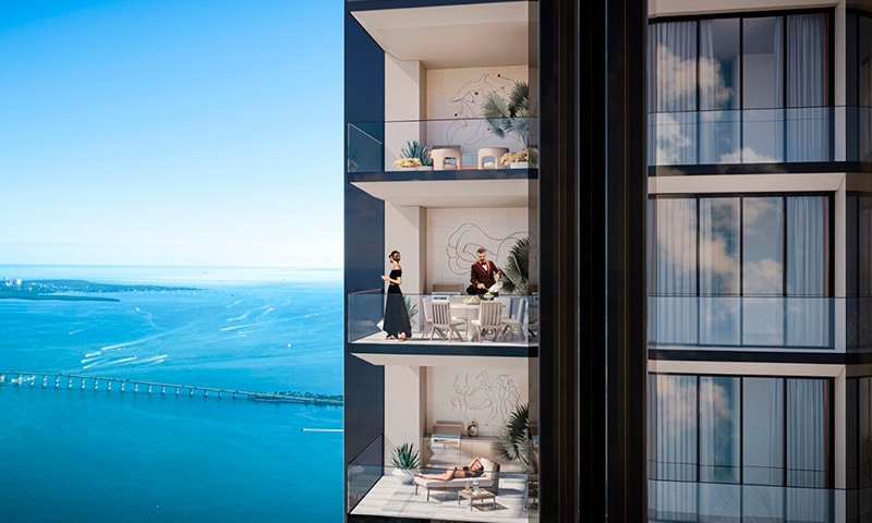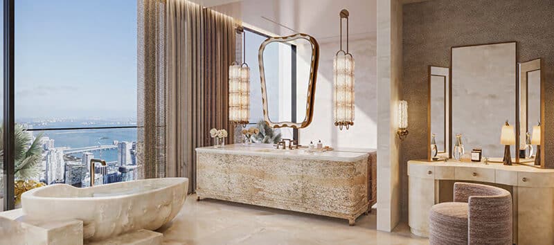 Es un proyecto residencial de lujo súper alto, con 1,049 pies de altura y 259 unidades híbridas de condominio-hotel. La torre presenta una fachada única de travertino marfil y columnas de acero de alto brillo para expresar peso y sustancia duraderos al mismo tiempo que brinda una apariencia gráfica y vertical definida, que la distingue de sus vecinas de vidrio y estuco.